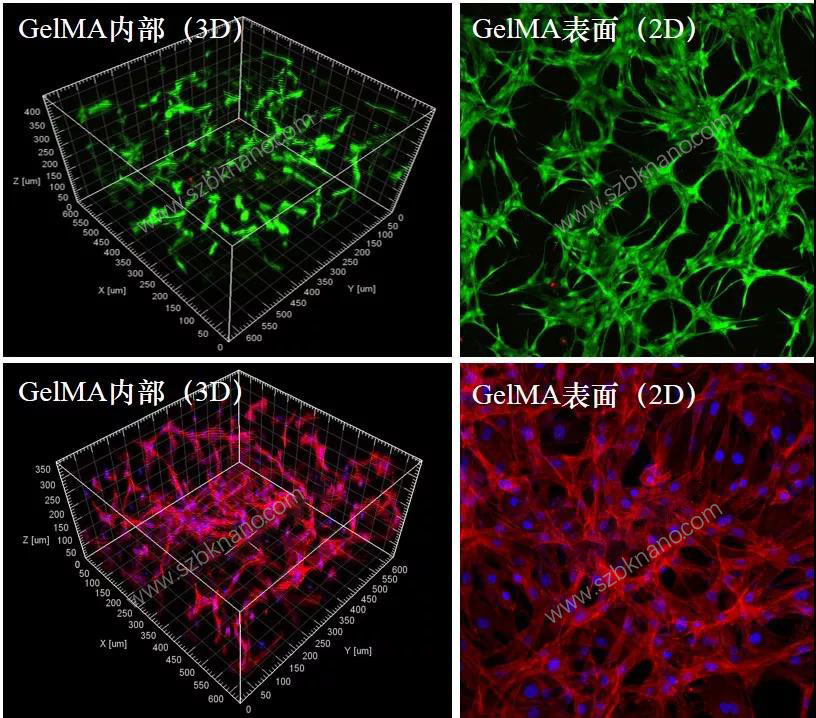 圖4 骨髓間充質干細胞(BMSC)在GelMA表面及內部培養效果