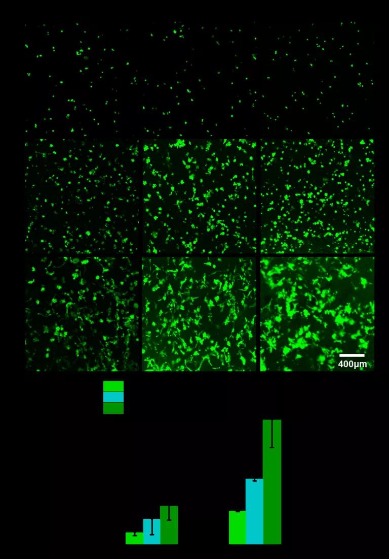在凝膠表面進行細胞培養時,多孔GelMA同樣具有優秀表現,貫通的孔道結構使接種在表面的細胞呈現向凝膠內部遷移的趨勢,第9天細胞遷移深度可達約540μm。(圖4)
