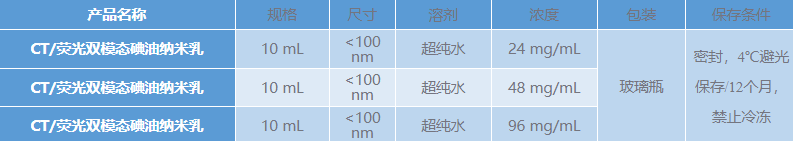 蘇州北科納米科技有限公司提供高質量的CT/熒光雙模態碘油納米乳,為乳白色泛綠澄清液體,分散于純水中,已采用0.22微米濾膜過濾并除菌。尺寸、碘濃度、熒光強度在一定范圍內可調、CT成像對比增強效果佳、低腎毒性、安全環保無污染,具有很好的分散性、穩定性佳,可用于小鼠腫瘤模型及其他模型CT熒光雙模態成像等。