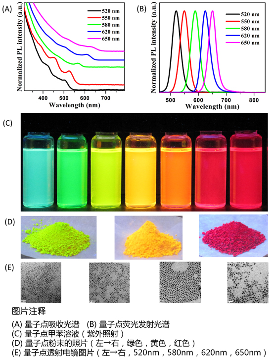 蘇州北科納米科技有限公司生產的油溶性CdSe/ZnS量子點產品是以CdSe為核心,ZnS為殼層,表面由疏水配體包裹的核/殼型熒光納米材料,平均的量子產率為80%,儲存時應避免陽光直射,4度密封暗處保存,可以為客戶訂制生產480nm~650nm任一波長不同克數的產品。本產品具有粒徑均一,吸收光譜寬泛,發射光譜窄而對稱,熒光強度高而穩定等特點,特別適用于量子點發光二極管(QLED)的綠光和紅光組成部分,可應用于太陽能電池、發光器件與生物熒光標記等領域。