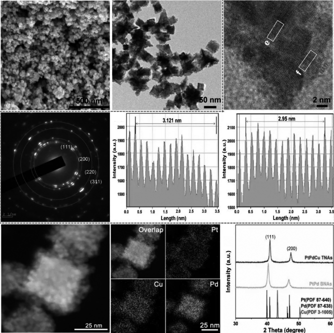 產品性能:PtPdCu合金顆粒相與PtPd納米顆粒和商業Pt/C催化劑相比,表現出顯著增強的類酶催化活性(包括過氧化物酶、亞鐵氧化酶、過氧化氫酶)和1,1-二苯基-2-三硝基苯肼(DPPH)自由基清除能力。PtPdCu納米酶優異的過氧化氫酶活性和自由基清除活性也有望在生物保護中發揮作用。