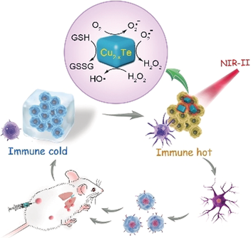 【主要優勢】1、Cu2−xTe納米顆粒在近紅外ii (NIR-II)光下表現出可調節的酶模擬活性(包括谷胱甘肽氧化酶和過氧化物酶);2、Cu2−xTe人工酶催化的級聯反應逐漸升高腫瘤內氧化應激,誘導免疫原性細胞死亡;