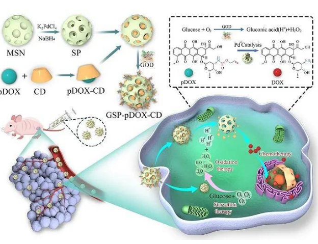 組成:介孔二氧化硅、納米鈀、阿霉素前藥及葡萄糖氧化酶