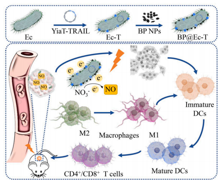 其他說明:密封狀態(tài)下保質(zhì)期半年【主要優(yōu)勢(shì)】該細(xì)菌通過外膜YiaT蛋白(Ec-T)表達(dá)腫瘤壞死因子相關(guān)的凋亡誘導(dǎo)配體(TRAIL)。可以轉(zhuǎn)移激光照射后BP NPs產(chǎn)生的光電子,觸發(fā)硝酸鹽還原代謝為一氧化氮,在腫瘤部位原位釋放,促進(jìn)治療效果和腫瘤相關(guān)巨噬細(xì)胞向M1表型極化。同時(shí),活性氧的產(chǎn)生誘導(dǎo)免疫原性細(xì)胞死亡,進(jìn)一步提高其抗腫瘤療效。