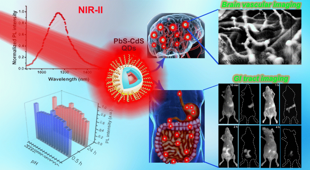 利用近紅外二區(qū)熒光成像技術(shù)實現(xiàn)了對活體小鼠腦部血管和胃腸道的造影。在該工作中,該課題組用一種在近紅外二區(qū)(NIR-II, 1000-1700nm)波段發(fā)光很強的PbS@CdS量子點(量子產(chǎn)率為60%)經(jīng)雙層包覆的形成發(fā)光很強的PbS@CdS@SiO2@F-127納米顆粒,同時該納米顆粒還具備了非常好的pH穩(wěn)定性和生物兼容性。課題組將PbS@CdS@SiO2@F-127納米顆粒經(jīng)尾靜脈注射到小鼠體內(nèi),用785nm波長(位于近紅外一區(qū))的激光激發(fā)小鼠腦血管實現(xiàn)顯微成像,觀察到了深層腦部血管的清晰結(jié)構(gòu),成像深度可達950μm。同時,課題組還將微量(80μg/kg)PbS@CdS@SiO2@F-127納米顆粒注入到小鼠體內(nèi),利用近紅外二區(qū)熒光成像技術(shù)實現(xiàn)了小鼠胃腸道的造影,觀測到了高信噪比的胃腸道結(jié)構(gòu)。該文章發(fā)表在由德國化學(xué)協(xié)會(Wiley)主辦的2017年最新一期Advanced Functional Materials上,該雜志2016年影響因子為12.1,屬于中科院JCR期刊一區(qū),是納米功能材料領(lǐng)域的權(quán)威。本項研究為生產(chǎn)高效率高穩(wěn)定量子點熒光造影劑提供了一種新型技術(shù)指導(dǎo)方案。