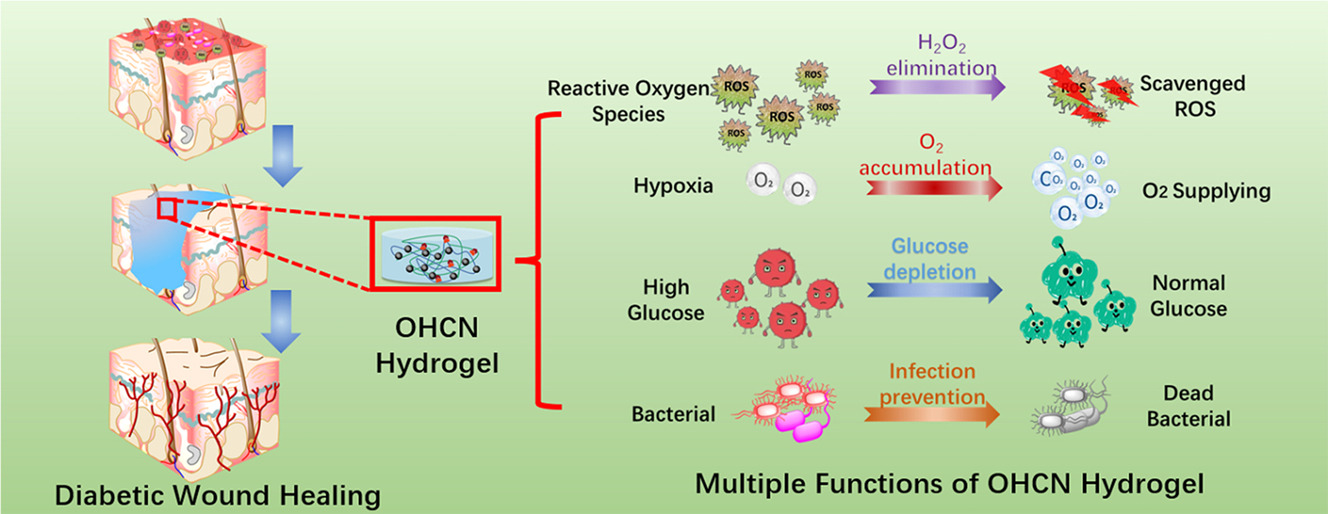 其他說明:密封狀態下保質期半年【主要優勢】OHA和抗菌CMCS的動態交聯賦予了OHCN水凝膠敷料優異的抗菌和自愈性能。同時,Au-Pt合金納米粒子通過模擬葡萄糖氧化酶和過氧化氫酶,賦予了OHCN水凝膠敷料降低血糖、減輕氧化損傷、提供O2等功能。通過OHC水凝膠和Au-Pt合金納米粒子的協同組合,所得OHCN水凝膠敷料顯著改善了病理微環境,加快了糖尿病傷口的愈合速度