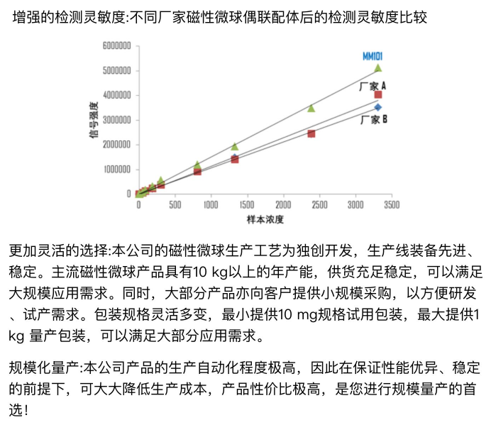 It can migrate rapidly under the action of a magnetic field. After the magnetic field is removed, there is no remanence, and it can be quickly dispersed again. The magnetic part is wrapped with a layer of polymer to completely seal the magnetic particles inside the microspheres. Finally, a layer of special hydrophilic material is modified on the surface (also applied to all magnetic microsphere products of our company) to give the microspheres hydrophilicity and excellent suspension stability. It can be taken as a liquid, easy to operate, and adaptable to different buffer solutions and acid-base environments. The regular spherical morphology minimizes non-specific adsorption and reduces the risk of microsphere agglomeration.