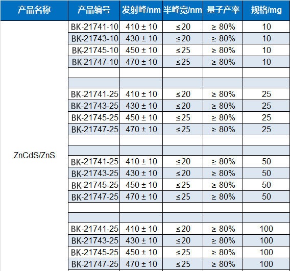 The oil-soluble ZnCdS/ZnS quantum dot product produced by Suzhou Beike Nano Technology Co., Ltd. is based on ZnCdS as the core, ZnS as the shell, and the surface of the core/shell type fluorescent nanomaterial covered by hydrophobic ligands. The average quantum yield is 80. %. Avoid direct sunlight during storage, and store in a 4 degree sealed dark place. Products with different grams of wavelength around 400-470 nm can be customized for customers. This product has the characteristics of uniform particle size, broad absorption spectrum, symmetrical emission spectrum, high and stable fluorescence intensity, etc. It is especially suitable for the blue component of quantum dot light-emitting diodes (QLED), and also suitable for solar cells and bioluminescent labels.