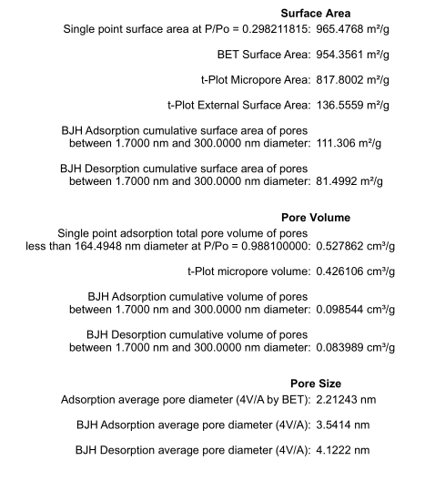 Specific surface area: 954m2/g; average pore size: 2-3nm