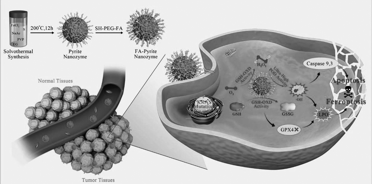Product performance: The highly active pyrite nanoenzyme overcomes the problem of low affinity of traditional peroxidase nanoenzymes for H2O2, and can catalyze the production of a large number of hydroxyl radicals from the limited H2O2 at the tumor site. At the same time, the discovery of glutathione oxidase activity, a new activity of pyrite nanozymes, can not only provide substrate H2O2 for its peroxidase activity, but also catalyze the oxidation of glutathione and cause cellular iron. Death, so as to realize tumor apoptosis-iron death synergistic treatment. The important thing is that pyrite nanozymes do not need any other help, and a single material can achieve efficient and safe tumor treatment effects, indicating that it has great clinical transformation potential.