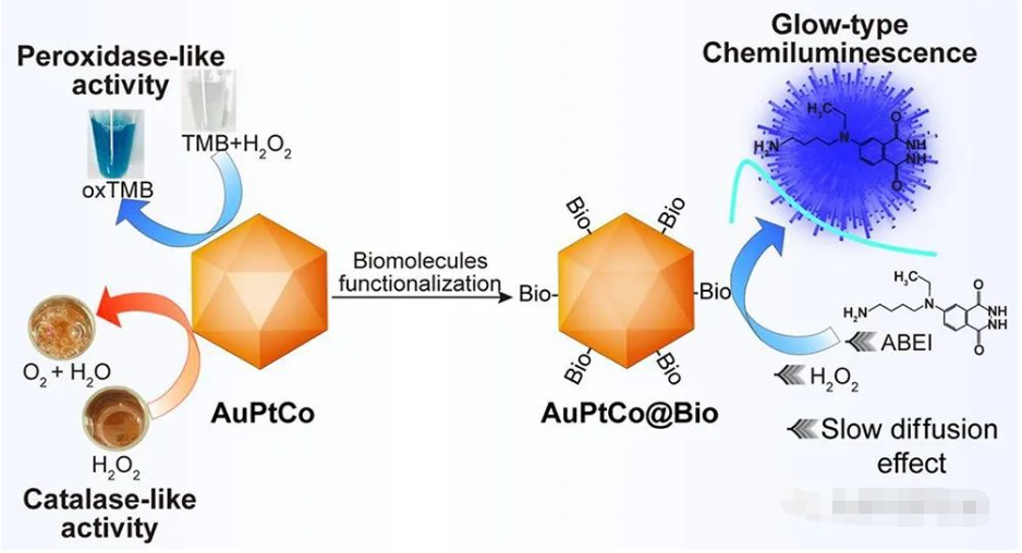 Other instructions: shelf life of half a year in sealed state [main advantages] 1. Using good charge transfer and synergistic effect between gold, platinum and cobalt, AuPtCo shows stronger catalytic activity than HRP and other artificial nanoenzymes, which can catalyze the ABEI-H2O2 reaction to produce flash CL emission; 2. Biofunctionalization of AuPtCo surface (AuPtCo@Bio) has demonstrated the slow diffusion effect on delayed CL emission.