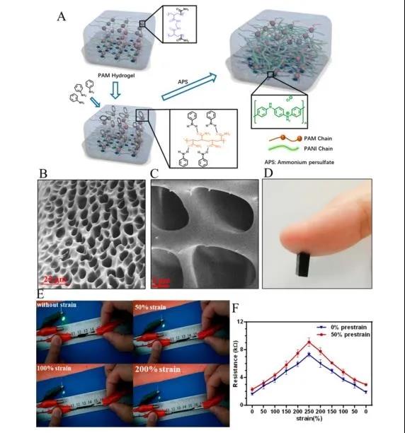 通過聚苯胺(PANI)和聚丙烯酰胺(PAM)的共聚,制備了導電性能優良、力學性能與神經組織相似、生物相容性好的堅韌導電水凝膠。PAM的酰胺鍵可以與苯胺分子相互作用,可原位吸附并誘導苯胺聚合,形成透明的PAM/PANI導電凝膠。冷凍干燥后,用掃描電鏡(SEM)觀察CPHs的橫斷面形態。與典型的水凝膠類似,CPHs表現出三維微孔泡沫網絡。有利于三維水凝膠結構內的細胞穿透和組織形成(圖2B,C)。與此同時,由于PANI的摻雜,制備型CPHs表現出良好的電學性能,即使它們被延長到原來長度的三倍(圖2E,F)。