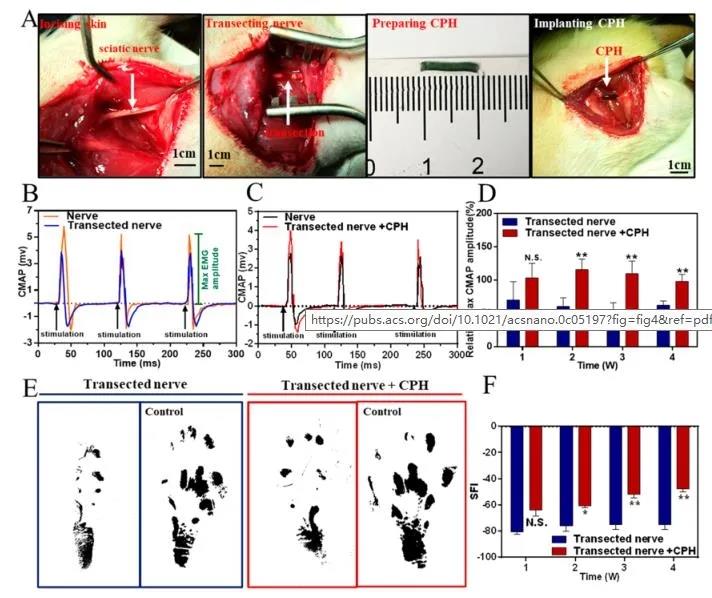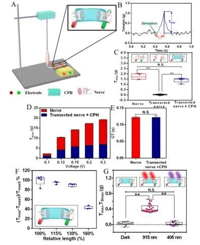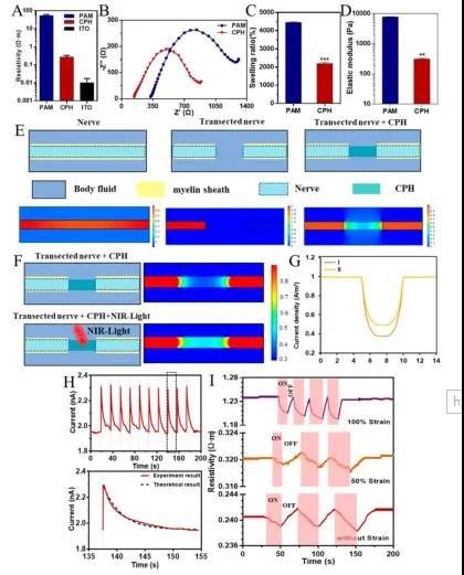如圖3所示,CPH的電阻率(0.2 - 0.3Ω·米)遠優于PAM,這是由于聚苯胺的摻雜。電化學阻抗譜(EIS)檢測了CPH在PBS中的電活性。如圖3B所示,PAM和CPH的Nyquist圖在高頻區域呈準半圓形,說明PAM和CPH都具有電荷轉移的能力。此外,還模擬了CPH在體內替代受損神經的可行性和生物電信號在神經中的傳導。如圖3E所示,當神經完全受損時,生物電信號無法傳輸。將受損神經與CPH連接后,可恢復生物電信號傳輸功能。