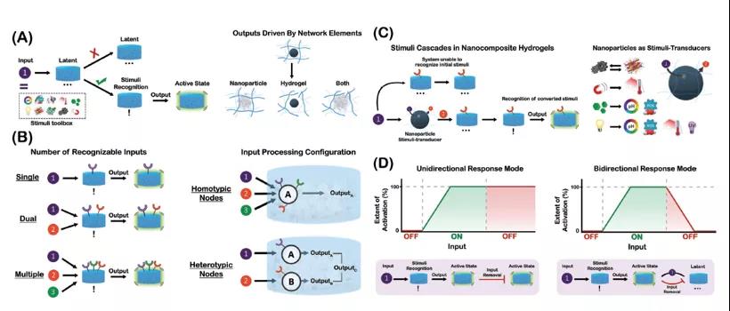圖1. 刺激響應型納米復合水凝膠對內外刺激輸入動態反應的過程。[內容解讀]1.納米復合水凝膠的設計和組裝方式納米復合水凝膠指含有納米材料的水化聚合物網絡,能通過非共價相互作用或共價連接組裝形成。獨立式體系中只需其中一個模塊間有相互作用,另一成分作為網絡填充成分,通過自交聯形成更牢固的體系;而共依存體系的組裝需要有水凝膠-NP間的相互作用,得到的復合凝膠可能是兩成分的加和或協同作用。復合體系的組裝方式通常分為四種:(1)水凝膠前驅液加在預組裝的NP懸浮液中進行交聯,使粒子在支架中預分布;(2)水凝膠交聯后原位形成NP;(3)水凝膠交聯后,預組裝的納米粒子向內擴散;(4)通過納米粒子作為基質/網絡交聯劑組裝的共依存水凝膠。2.刺激響應型納米復合水凝膠的設計方案NP和水凝膠的結合能形成性能優異的體系,通過刺激響應能將性能進一步擴展。通常復合水凝膠可以解構成NP或水凝膠基質等核心成分,作為材料中的刺激響應或效應模塊,在識別后以輸出形式引起體系變化。除了對單刺激產生響應,生物系統還能配備多種受體對不同的刺激輸入作出反應,并根據組成來識別和處理不同數量的刺激并將其作為初始輸入信號,而納米復合水凝膠的多組分和分級結構也有利于通過結合水凝膠基質和NP來編碼多種刺激響應。開發這種多刺激反應體系對于改善體內藥物運輸的敏感性和順應性至關重要。此外,和活細胞類似,部分NP也能利于自身的轉化能力作為智能轉化成分,通過轉換結點將多種刺激有序連接,并通過NP刺激傳感器對很多曾經無法識別的刺激做出響應。目前的刺激轉換結點大多來自作為天然刺激傳感器的納米材料或能承載刺激轉換特性的NP。而根據所識別的刺激,響應分為單向和雙向兩種模式。