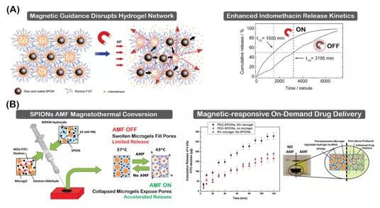 圖4. 磁響應型納米復合水凝膠的按需給藥過程。[結論與展望]與靜態平臺相比,刺激響應型納米復合水凝膠對于開發復雜的生物功能平臺有更明顯的優勢,正如本文所述,NP和水凝膠結合的產物顯示了優異的設計和組裝靈活性,以及對生物醫學性能的增強。但無論其潛力和發展焦點多么引人關注,這種復合材料目前還未獲得監管部門批準在醫療保健使用,如何克服從實驗室到臨床之間的障礙,仍是研究中所面臨的重大挑戰。