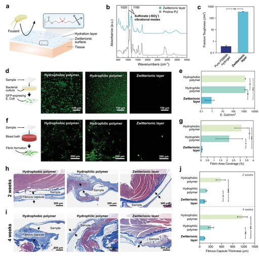 為了減輕生物積垢和術后炎癥,作者將兩性離子互穿的彈性體層整合在貼劑的非粘合性表面上(圖1a)。已經發現兩性離子聚合物具有優異的防污性能。它們獨特的抗污垢吸附能力歸因于凈中性聚合物鏈中存在陽離子和陰離子基團,它們促進了緊密水合殼的形成,同時最大限度地減少了游離水分子的氫鍵結構(圖3a)。這種水合殼的能量消耗很高,從而阻止了細菌和生物分子的表面吸附,這些細菌和生物分子與諸如感染,血液凝固和術后粘連形成等炎癥反應有關。然而,兩性離子水凝膠通常具有較差的機械性能,例如低韌性和可拉伸性,這可能不利于它們在動態生理環境中的長期堅固性和穩定性。