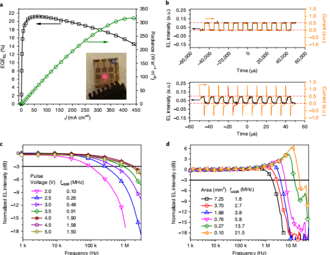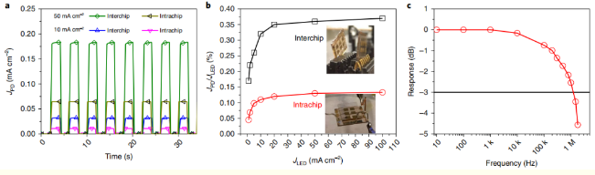 作者已經證明,光信號發射器和接收器功能可以使用金屬鹵化物鈣鈦礦集成到一個器件中。可以通過更改偏置方向來可逆地切換器件的兩個功能。當用作發光或光檢測裝置時,該二極管顯示出與最先進的單功能鈣鈦礦器件相當的高性能。對鈣鈦礦發光器件的響應速度進行了系統的研究,對于0.1mm2的器件,其響應速度約為21MHz。鈣鈦礦二極管對同一個二極管發出的光具有很高的靈敏度,這為簡化光電器件的集成提供了獨特的機會。我們通過構建基于兩個相同的鈣鈦礦二極管的單片脈沖傳感器系統和雙向光通信系統來證明這一點。此外,由于器件主要受寄生電容的限制,我們希望通過減小像素的尺寸可以進一步提高器件的響應速度。這將允許發展高速的顯示器到顯示器的通信或數據交換。這些特性,加上在各種無機襯底上的集成簡便性以及與互補金屬氧化物半導體的兼容性,使得這種雙功能鈣鈦礦二極管有望在未來的溶液處理光電集成電路中用于芯片間或芯片內數據鏈路。
