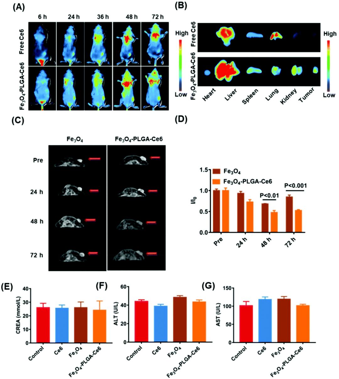 (2)此外,磁性單分散的Fe3O4也具有優良的T2加權磁共振成像(MRI)性能。綜上所述,Fe3O4-PLGA-Ce6納米系統可以發揮光動力-鐵死亡抗腫瘤治療的協同作用,可以在MRI指導下產生具有高生物相容性的腫瘤抑制效果。