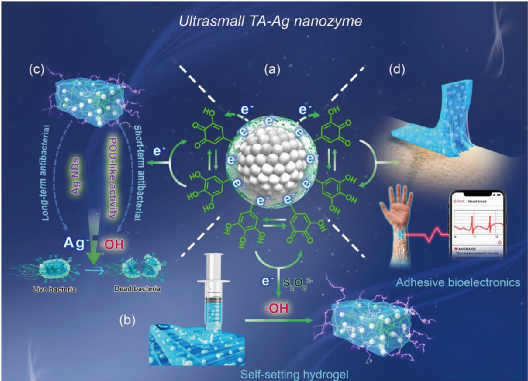 圖1. 仿貽貝納米酶(TA-Ag)催化機理。(a)仿貽貝納米酶通過其表面的電子轉移維持酚-醌氧化還原平衡。(b)仿貽貝納米酶催化水凝膠自成型。(c)仿貽貝納米酶賦予水凝膠催化抗菌性能。(d)仿貽貝納米酶賦予了水凝膠良好的機械性能、粘附性和導電性,可用于粘附人體皮膚檢測生理信號。