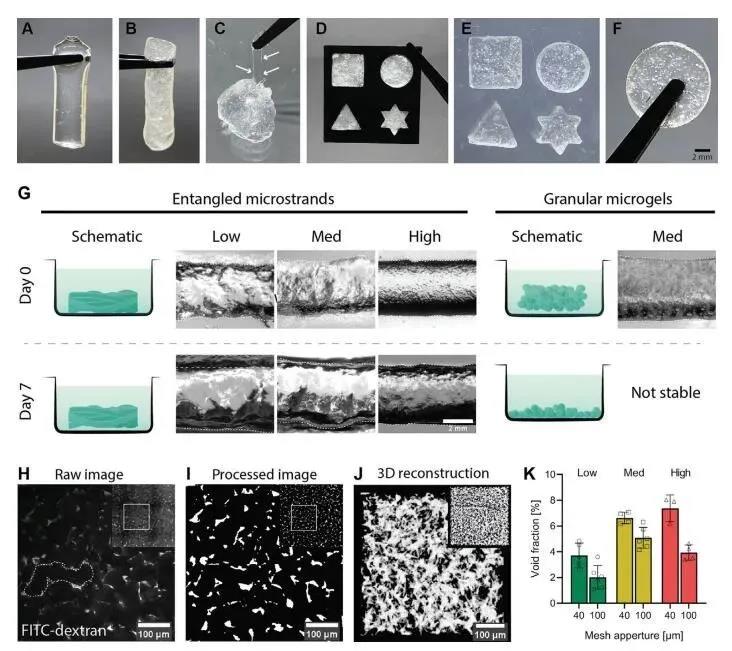 為了研究3D打印纏結(jié)微束型凝膠的可調(diào)性,研究者通過調(diào)整UV交聯(lián)時間(20s、60s、180s)制備了一系列不同交聯(lián)強度的HA-MA體系凝膠。對比顆粒水凝膠,37℃下浸泡于PBS 7天中,塊體微凝膠在1h內(nèi)瓦解掉,而纏結(jié)微束型水凝膠在水介質(zhì)中具有長期的凝聚力。為了評估HA-MA纏結(jié)微束型凝膠的孔隙率,研究者將凝膠浸入高分子量葡聚糖熒光染料中。由于葡聚糖的分子量較大,圖2H顯示出熒光標記的葡聚糖只能進入凝膠束之間,而無法穿透水凝膠的凝膠相,基于此,研究者可用來計算凝膠的孔隙率(圖2)。
