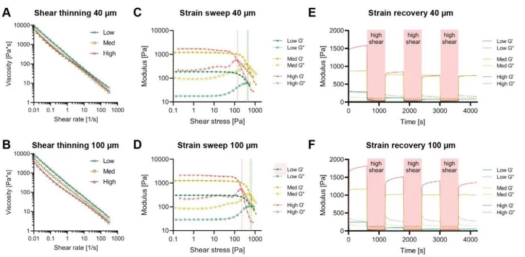 纏結(jié)微束型凝膠表現(xiàn)出剪切變稀的流變學特性,這是擠出式3D生物打印所必需的。通過流變學測定,不同交聯(lián)強度的HA-MA微束型凝膠的剪切恢復率不同,且隨著篩網(wǎng)孔徑的不同而改變,通過比對,研究者指出中等交聯(lián)強度的纏結(jié)微束型凝膠樣在初始剪切后的剪切恢復率為81.8% (篩網(wǎng)孔徑40 μm)和82% (篩網(wǎng)孔徑100 μm),明顯優(yōu)于其他兩組,可作為優(yōu)良的3D打印生物墨水(圖3)。