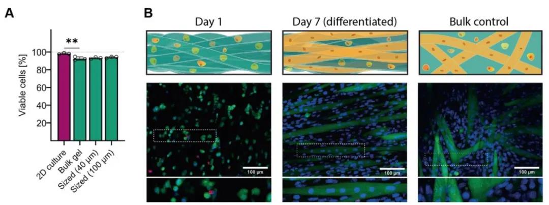 該研究以高縱橫比水凝膠微束為生物墨水,該生物墨水中的凝膠微束相互纏結(jié)形成多孔且穩(wěn)定的凝膠網(wǎng)絡。且該纏結(jié)微束型凝膠能夠促進成肌細胞的肌管形成,并維持相對較高的細胞活性(90%)。軟骨細胞與凝膠微束共沉積打印形成的凝膠支架可誘導軟骨細胞形成豐富的細胞外基質(zhì),使其壓縮模量得到顯著地提升。該研究中微束型水凝膠的構建策略為3D打印生物墨水提供了一種新型的制備手段。