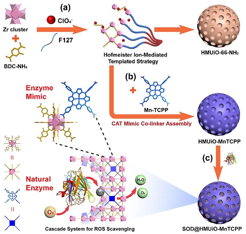 針對上述問題,華東理工大學顧金樓教授團隊在前期研究的基礎上,開發了一種Hofmeister離子介導的軟模板自組裝策略,實現了介孔MOFs的可控合成,并在此基礎上對MOFs的微介孔結構進行分級功能化,成功構建了納米級偶聯生物反應器用于細胞內活性氧的清除。如圖1所示,作者采用UiO-66型MOF作為基體,F127作為模板劑,ClO4-作為鹽溶離子,合成了孔徑約為7 nm的納米介孔MOFs。同時,得益于Zr6團簇配位方式的多樣性,具有過氧化氫酶(CAT)活性的錳卟啉分子可作為配體引入到骨架中,與介孔內負載的天然超氧化物歧化酶(SOD)協同作用構成級聯抗氧化系統用于細胞內活性氧(ROS)的高效清除。
