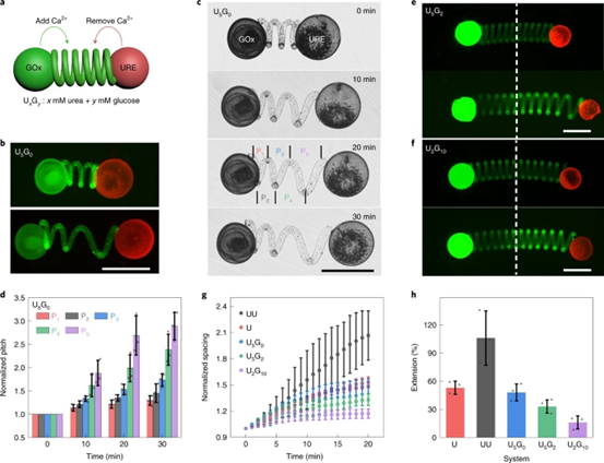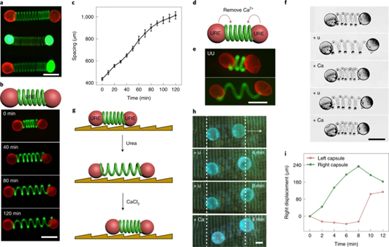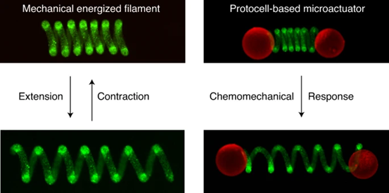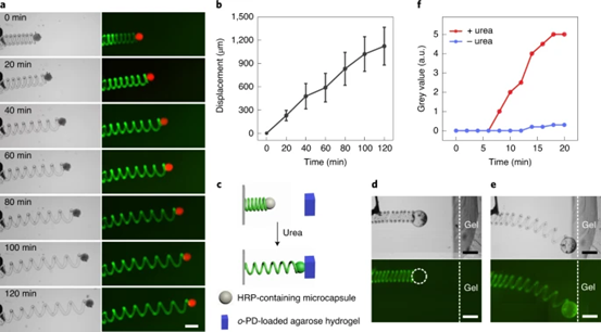 人工細胞樣群落參與多種化學相互作用模式,但與當地環境的接觸極少。最近,英國布里斯托大學Mei Li博士/Stephen Mann院士團隊開發了一種交互式微系統,該系統基于將一群酶活性半透性蛋白體固定在螺旋水凝膠絲內,以實現信號誘導運動。