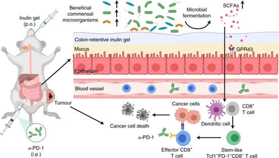 圖 1:使用結(jié)腸滯留菊粉凝膠原位調(diào)節(jié)腸道微生物群以改善癌癥免疫治療。
