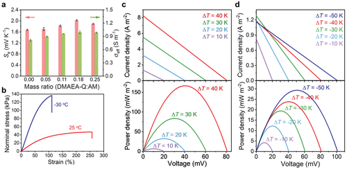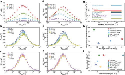 圖2 有機水凝膠熱電池的熱電和機械性能。