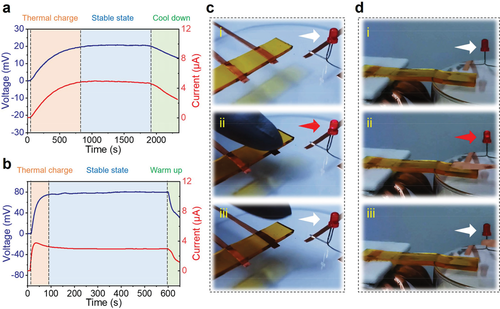 圖3 變形過程中有機水凝膠熱電池的輸出電壓和電流。
