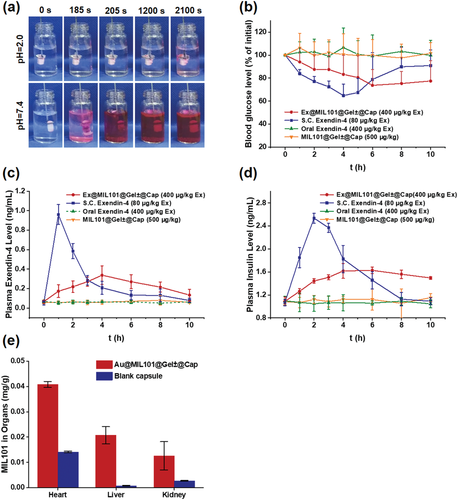 此外,MOF-Gel 納米顆粒顯示出超過 40% 的高 exendin-4 負載含量,并且肽在含有磷酸鹽的溶液中快速釋放。與沒有水凝膠殼或帶單電荷水凝膠殼的 MOF 納米顆粒相比,具有兩性離子水凝膠殼的 MOF 納米顆粒顯示出增強的粘液滲透和 Caco-2 和 E12 細胞的細胞內化。基于熒光成像,在空腸注射到 BALB/c 裸鼠后,含有羅丹明 B 標記的 exendin-4 的 Ex@MIL101@Gel± 納米顆粒與游離的 exendin-4 相比表現出增強的腸道 exendin-4 吸收。此外,Au@MIL101@Gel±@Cap 的口服給藥進一步證實了口服給藥的 MOF-Gel 納米顆粒的有效腸道吸收。在糖尿病大鼠模型中口服給藥后,Ex@MIL101@Gel±@Cap 導致血漿 exendin-4 水平顯著升高,有效刺激內源性胰島素分泌,對糖尿病大鼠產生顯著的降血糖作用,具有顯著的降血糖作用。相對藥理利用率為 17.26%。與口服胰島素治療相比,使用 exendin-4 發生低血糖的風險較低。包括水凝膠包覆的MOF納米顆粒和pH響應膠囊在內的載體材料可以輕松獲得,高DLE和exendin-4顯著增強的口服利用度促進了成本節約,同時為糖尿病患者提供了極大的便利和依從性優勢.因此,含有兩性離子水凝膠包被的 MOF 納米顆粒的腸道環境觸發的自解包膠囊作為載體具有巨大的潛力,可以克服口服肽遞送以有效治療糖尿病的關鍵障礙。