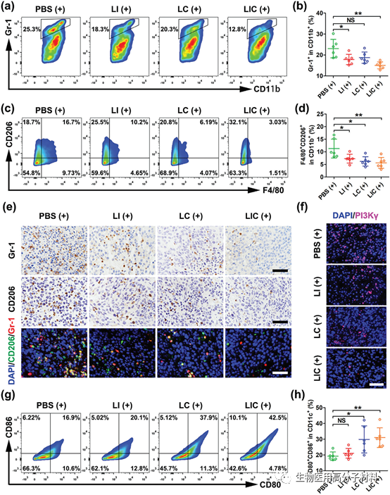 理想的腫瘤治療方法是消除原發腫瘤,同時觸發宿主抗腫瘤免疫反應,防止腫瘤復發和轉移。在此,中山大學帥心濤教授和魏波教授合作開發了一種脂質體封裝的磷酸肌醇抑制劑(PI3Kγ)IPI-549和光敏劑二氫卟吩e6(Ce6)的納米藥物(LIC),用于腸癌治療。LIC在激光照射下產生活性氧(ROS)并引起免疫原性腫瘤細胞死亡,在此過程中釋放CRT等免疫刺激信號,進一步誘導T淋巴細胞介導的腫瘤細胞殺傷。同時,IPI-549可以通過抑制PI3Kγ作用于髓系來源抑制性細胞(MDSC),最終導致精氨酸含量下降,與光動力治療產生的ROS共同作用,誘導MDSC凋亡,改善了腫瘤免疫抑制微環境,在治療原發腫瘤的基礎上激發了機體的免疫效應。