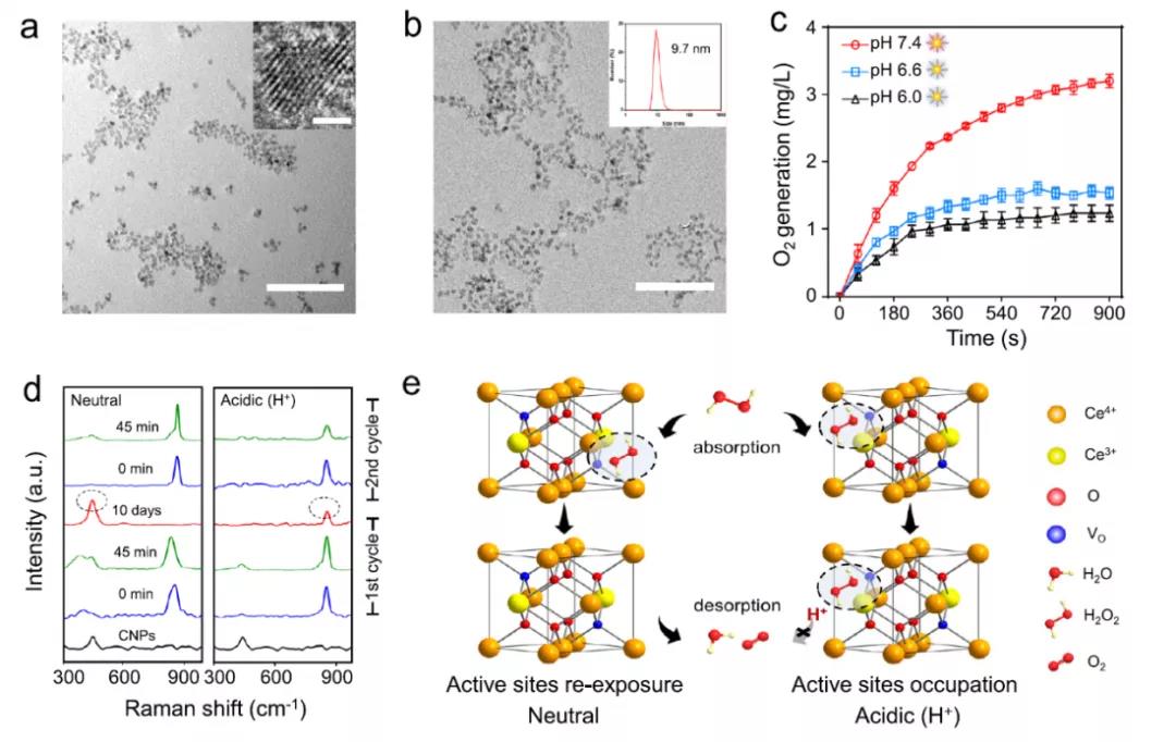 圖1(a)氯仿中超微CNPs的TEM圖像;(b)經DSPE-PEG修飾后的CNPs水相中TEM圖像,其中內插圖DLS數據表明DSPE-PEG水合直徑分布為9.7nm;(c)CNPs在不同pH下分解H2O2的O2產生量;(d)在中性和酸性pH,CNPs與H2O2反應下其不用時間的拉曼光譜;(e)CNPs pH環境依賴性表現出的類過氧化氫酶活性差異的化學模型示意圖。