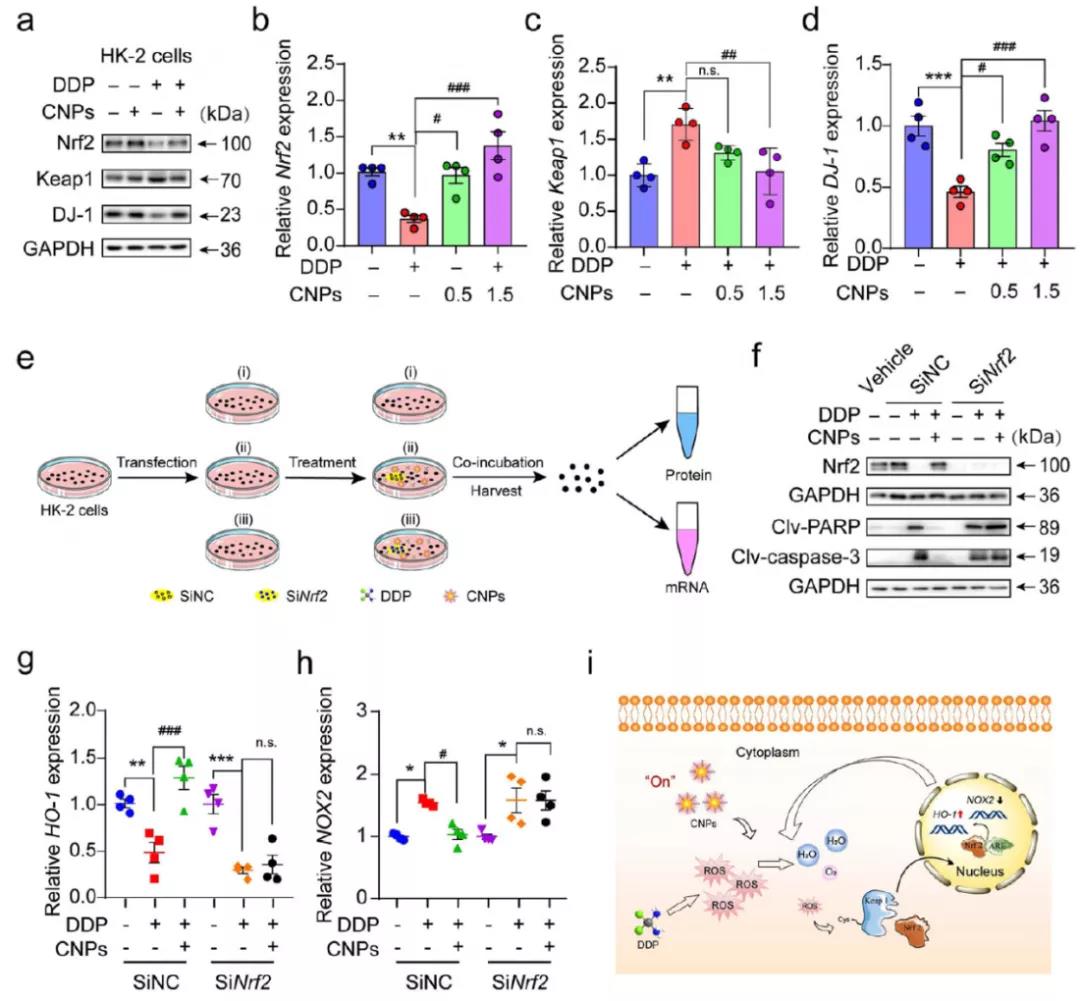 圖5 (a, b-d) 經不同處理后HK-2細胞中的Nrf2, Keap1和DJ-1蛋白質印跡分析及量化;(e-h) 利用小干擾RNA負調Nrf2后通過western blot和qRT-PCR分析相關基因的表達情況;(i) CNPs通過激活Nrf2/Keap1,對抗DDP引起的氧化應激的細胞內信號轉導示意圖。