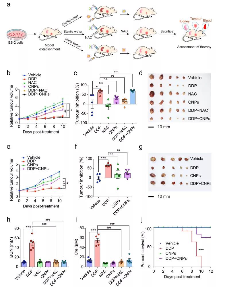圖6 (a) ES-2皮下瘤小鼠治療方式與評估示意圖;(b-g)不同處理的腫瘤體積、抑制效率和實體腫瘤大小;(h, i)不同處理下小鼠的BUN和Cre的水平以及(j)不同處理下小鼠的存活率。