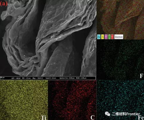 從掃描電鏡中可以清楚地觀察到FTC的每一個(gè)側(cè)層,周圍元素作圖顯示,Ti、C、F和Fe元素在FTC中均勻分散。