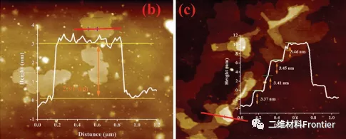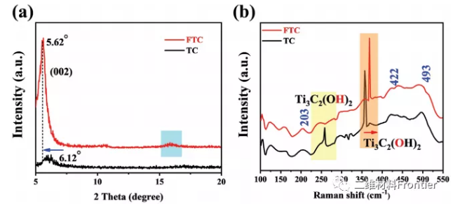 用原子力顯微鏡比較了TC和FTC的厚度(AFM,圖2b,c)。TC顯示了完整的單層Ti3C2Tx(T=-F,-O,-OH,表面的懸浮部分)結(jié)構(gòu) 厚度約為2.91nm,相當(dāng)于5個(gè)單原子層的厚度;FTC的AFM光譜顯示了一個(gè)層狀結(jié)構(gòu),其平均層間間距擴(kuò)大了3.42nm。