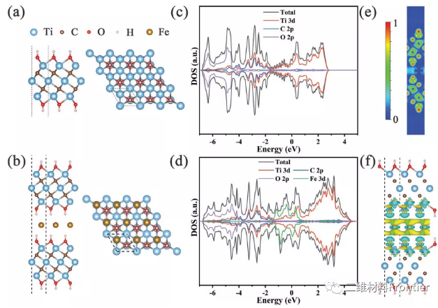 如圖5所示,a的TC和b的FTC結(jié)構(gòu)模型的側(cè)面(左)和頂部(右)視圖,其中藍(lán)色、棕色、紅色、灰色、金分別對(duì)應(yīng)于Ti、C、O、H、Fe。c圖和d圖分別是TC、FTC的狀態(tài)密度。e圖是FTC(110)平面的平面內(nèi)電子定位函數(shù)(ELF)映射。f圖是FTC的差分電荷密度。等位面設(shè)置為0.01eA−3。藍(lán)色表示電子消散,黃色表示電子聚集。