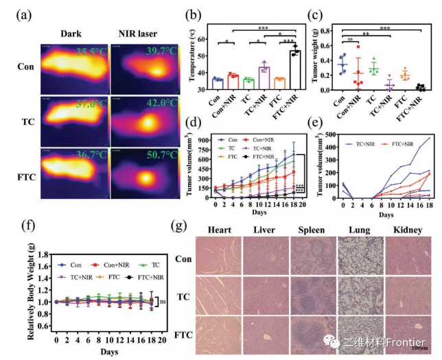綜上所述,作者開發(fā)了一種基于Fe(II)摻雜的2DTi3C2為優(yōu)越的區(qū)域光熱和ROS轉(zhuǎn)化為有效的無活性腫瘤。剝離的超薄Ti3C2Tx與Fe離子結(jié)合,實(shí)現(xiàn)了NIR照射下亞鐵離子的存儲(chǔ)和釋放,這使其對(duì)芬頓反應(yīng)的協(xié)同效應(yīng)具有良好的CDT效應(yīng)。GSH減少到產(chǎn)生ROS并克服TME中的缺氧。同時(shí),層間的Fe2+離子在c軸上構(gòu)建了導(dǎo)電層,促進(jìn)了電荷在c軸層內(nèi)的傳輸和改善 FTC的橫向電導(dǎo)率。因此,本研究為ti3c2多功能生物制劑的應(yīng)用開辟了新的視野。更值得稱贊的是,它為開發(fā)MXenes(Nb2C、V2C和Ti3C2)用于癌癥治療提供了全新的見解,不局限于作為光熱劑,也被視為ROS生成的藥物載體或生物成像的傳感器。