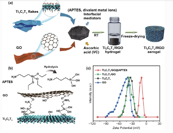 本工作中,通過合適的交聯劑(氨基-丙基三乙氧基硅烷、Mn2+、Fe2+、Zn2+和 Co2+)作為界面介質來設計層間相互作用,以在室溫下實現氧化石墨烯 (GO) 輔助組裝 Ti3C2Tx MXene 氣凝膠。