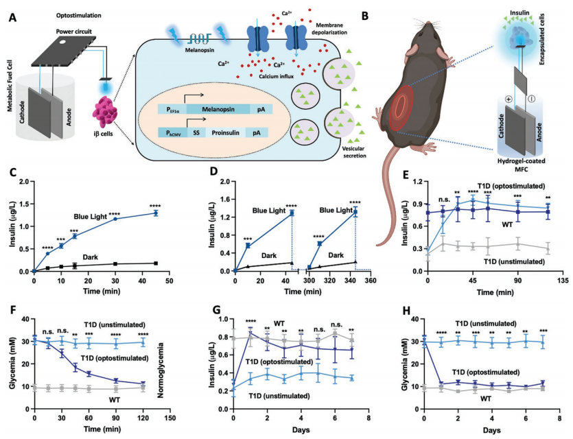 目前可用的生物電子設備消耗太多的能量,無法在可充電電池上連續運行,而且通常是無線供電,伴隨著可靠性、便利性和移動性等問題。因此,一種在生理條件下工作的強大的、自給自足的、可植入的發電機的可用性將對許多應用產生革命性的影響,從驅動生物電子植入物和假體到編程細胞行為和患者的新陳代謝。在這里,利用一種新的含銅、導電性調諧的3D碳納米管復合材料,設計了一種可植入的血糖代謝燃料電池,該電池可以連續監測血糖水平,在高血糖期間將多余的葡萄糖轉化為電能,并產生足夠的能量(0.7 mW/cm-2, 0.9 V, 50 mM葡萄糖)來驅動工程細胞泡狀胰島素釋放的光和電遺傳調節。研究表明,在I型糖尿病的實驗模型中,通過結合電代謝轉化和胰島素釋放介導的細胞消耗,將血糖監測與消除過量血糖相結合,使代謝燃料電池能夠以自動、自給自足和閉環的方式恢復血糖穩態。