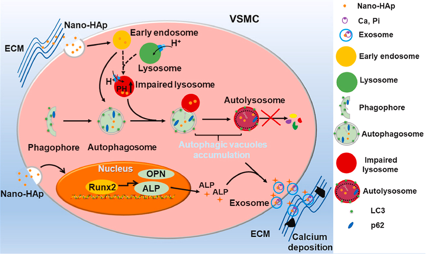 血管鈣化(VC)是衰老、糖尿病、慢性腎功能衰竭和動脈粥樣硬化的共同特征。VC的基本成分是羥基磷灰石(HAp)。納米大小的HAp(nHAp)已被確定在脈管系統(tǒng)病理性鈣化的發(fā)展中起重要作用。然而,nHAp是否可以在體內(nèi)誘導鈣化以及nHAp在VC進展中的機制尚不清楚。我們發(fā)現(xiàn)nHAp存在于患者鈣化動脈中的血管平滑肌細胞(VSMC)及其細胞外基質(zhì)(ECM) 中。合成的nHAp與從鈣化動脈中回收的天然nHAp具有相似的形態(tài)和化學特性。nHAp在體外刺激成骨分化并加速VSMC的礦化。合成的nHAp也可以在體內(nèi)直接誘導VC。從機制上講,ATPase用于酸化,因此阻止了VSMC中的自噬流。通過環(huán) 3’,5’-腺苷單磷酸(cAMP) 進行的溶酶體再酸化顯著增強了自噬降解并減弱了nHAp誘導的鈣化。積累的自噬體和自溶酶體轉化為含鈣的外泌體,分泌到ECM中并加速血管鈣沉積。VSMC中外泌體釋放的抑制減少了鈣沉積。總而言之,我們的結果證明了nHAp對溶酶體酸化的抑制作用,這抑制了自噬降解并促進了積累的自噬空泡轉化為裝載有未溶解的nHApCa 2+的外泌體, Pi和ALP。這些外泌體從質(zhì)膜上萌芽,沉積在 ECM 內(nèi),并形成鈣結節(jié)。因此,nHAP通過阻斷VSMC中的自噬流來加速血管鈣化。
