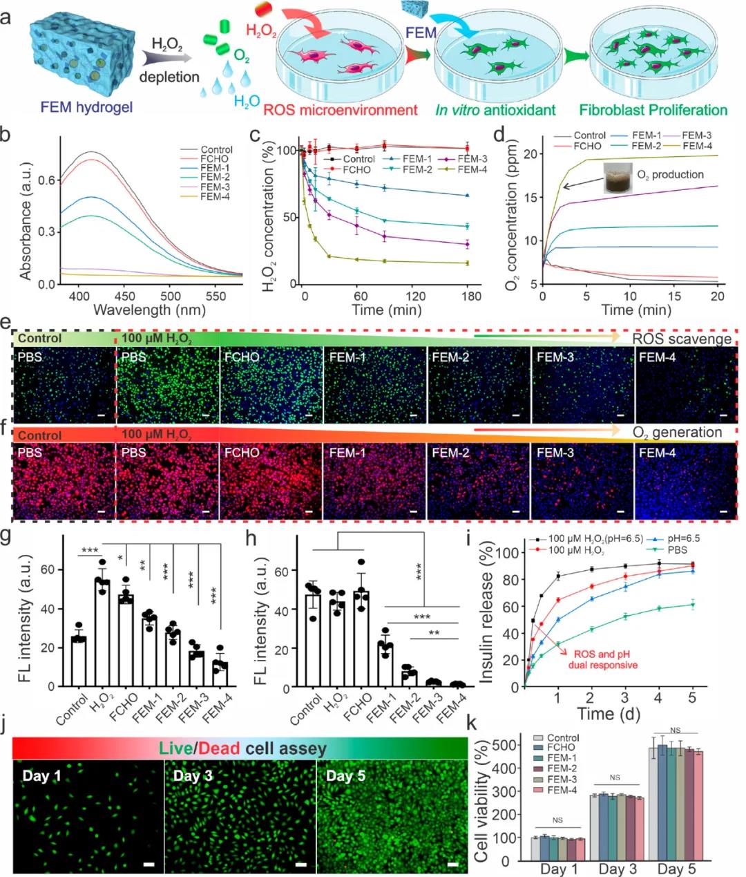 Researchers have studied the insulin release behavior of FEM hydrogel (Figure 3 ⅰ). Compared with the control group, under acidic and oxidative conditions, insulin is released rapidly within the first 6 hours, showing a unique pH/redox dual responsiveness.