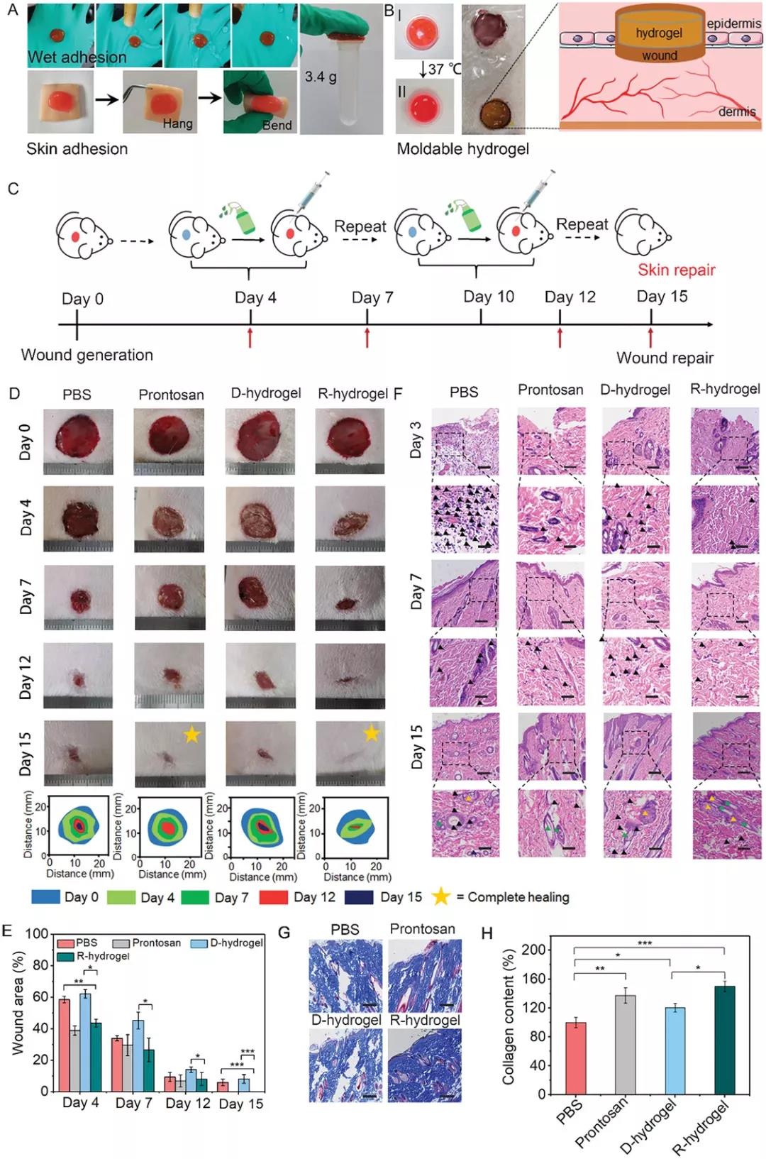Figure 4. Adhesion behavior of 2-FBC hydrogel and wound healing effect in vivo. A) After rinsing, the 2-FBC hydrogel adheres firmly to the rubber gloves and can withstand a load of 3.4 g. B) 2-FBC hydrogel can be formed. C) Schematic diagram of 2-FBC hydrogel wound treatment process. D) Use PBS (pH 7.4), commercially available wound dressing Prontosan, D-hydrogel (inject 2-FBC hydrogel into the wound area and then perform surgical excision) and R-hydrogel (hydrocoagulate 2-FBC) Glue is injected into the wound area and removed by cysteine-induced dissolution). F) H&E stained histological images of wound tissue in each treatment group. G) Masson stained histological image of skin tissue regeneration on the 15th day. H) Collagen content in different treatment groups based on Masson staining.