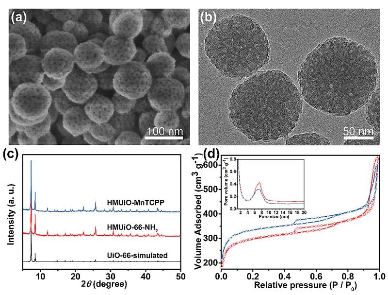 Figure 2. Typical SEM (a) and TEM (b) images of HMUiO-66-NH2. (C) XRD patterns of HMUiO-66-NH2, HMUiO-MnTCPP and simulated UiO-66. (D) N2 adsorption isotherms of HMUiO-66-NH2 (red) and HMUiO-MnTCPP (blue) and their corresponding BJH pore size distributions.