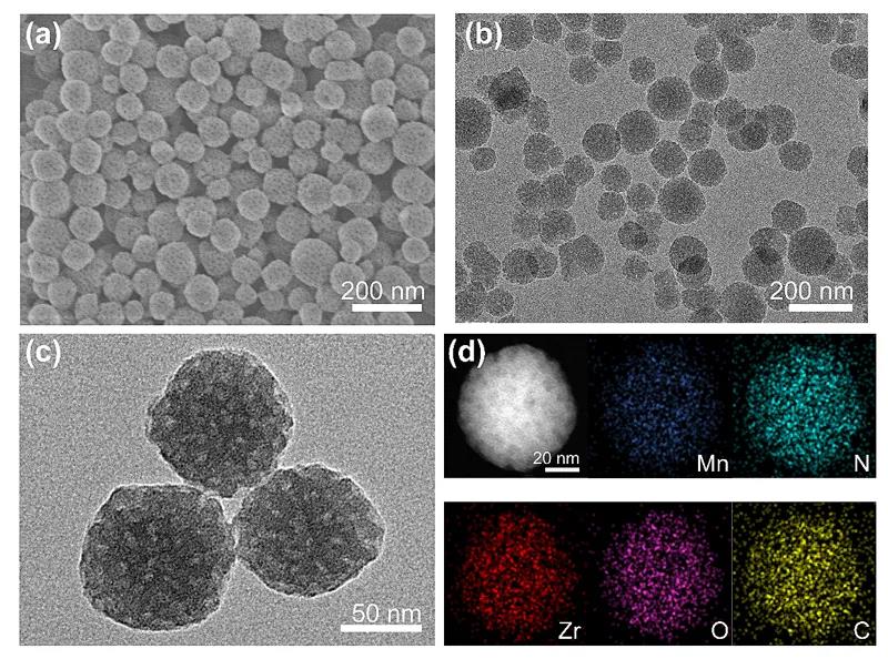 Figure 3. Typical SEM (a) and TEM (b, c) images of HMUiO-MnTCPP. (D) STEM images and element distribution diagrams of Mn, N, Zr, O, and C of the synthesized HMUiO-MnTCPP.