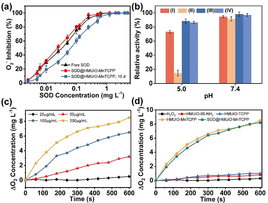 The results of in vitro experiments show that the mesoporous MOFs as a carrier can provide good protection to the loaded SOD. After soaking in the buffer for a period of time, SOD@HMUiO-MnTCPP still has higher O2-inhibitory activity than free SOD (Figure 4a, b). At the same time, the doped Mn-TCPP ligand imparts HMUiO-MnTCPP-like CAT activity, which can further decompose the H2O2 produced by SOD-catalyzed O2- into H2O and O2 (Figure 4c, d).