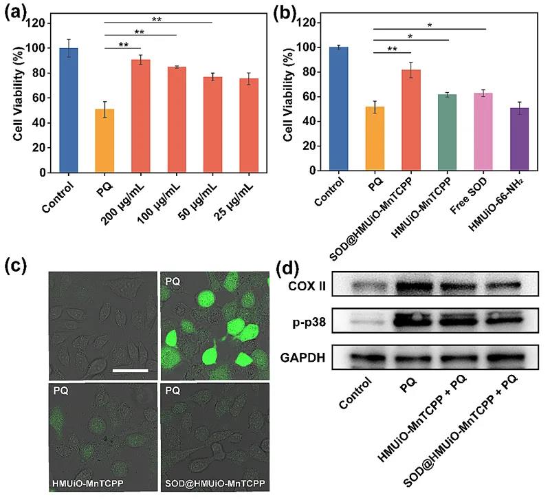 Subsequently, the team used paraquat (PQ) as an oxidative stressor to stimulate the overexpression of ROS in HeLa cells, and used this as a model to test the protective ability of the antioxidant system on cells. As shown in Figures 5a and 5b, the effect of SOD@HMUiO-MnTCPP on cell viability is positively correlated with dose. At the same time, compared with untreated cells, the cell survival rate of HMUiO-MnTCPP and free SOD treatment groups only slightly increased. It shows that the natural SOD and simulated CAT enzyme in SOD@HMUiO-MnTCPP have a synergistic effect on ROS clearance, so that the nanosystem has a more significant level of antioxidant protection. In order to further monitor the content of ROS in cells treated with different MOFs, the 2’,7’-dichlorofluorescein diacetic acid (DCFH-DA) method was used for testing. HeLa cells pretreated with PQ can produce significant fluorescence enhancement in laser confocal scanning microscopy (CLSM) imaging, which corresponds to the high level of ROS in the cells (Figure 5c). The fluorescence of the cells pretreated with SOD@HMUiO-MnTCPP was significantly reduced, which further proved the outstanding ability of the system to eliminate ROS. In addition, p-p38 and COX-II produced by oxidative stress were selected as biomarkers to further evaluate the antioxidant capacity of the nanosystem. Western Blot results showed that in the SOD@HMUiO-MnTCPP treatment group, the expression levels of intracellular p-p38 and COX II were significantly reduced, again indicating that the designed and synthesized functionalized bioreactor has the ability to clear intracellular O2- and H2O2 , Can effectively protect cells from oxidative damage (Figure 5d).