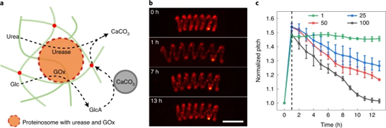 The team attached large single polynucleotide / peptide microcapsules at one or both ends of the helix like primitive cell filament to generate independent soft micro actuators that can sense and process chemical signals to perform mechanical work. Different translocation patterns are achieved through the synergistic or antagonistic enzyme reactions in the screw connector or the attached microcapsule load.